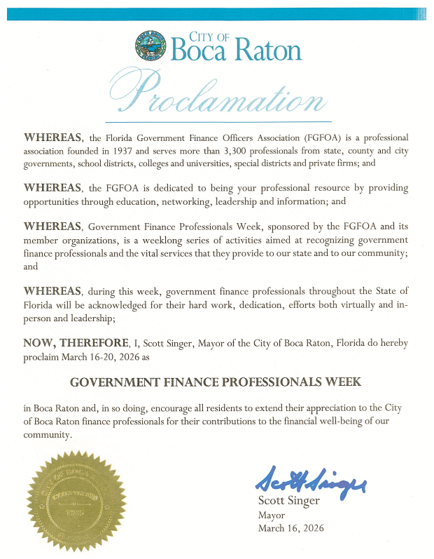 FGFOA will be sponsoring Government Finance Professionals Week, a weeklong series of activities aimed at recognizing government finance professionals and the vital services that they provide for local government and the community in which they serve. During this week, government finance professionals throughout the state will be recognized and acknowledged for their hard work, dedication and leadership.